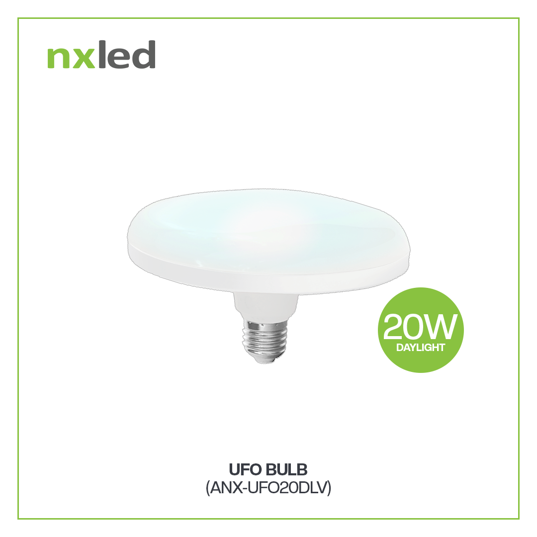 The NxLed LED UFO Bulb - Daylight 20W (ANX-UFO20DLV) provides bright daylight illumination ideal for home, office, or commercial spaces. Simply screw into any E27 socket to enjoy energy-efficient, long-lasting lighting.